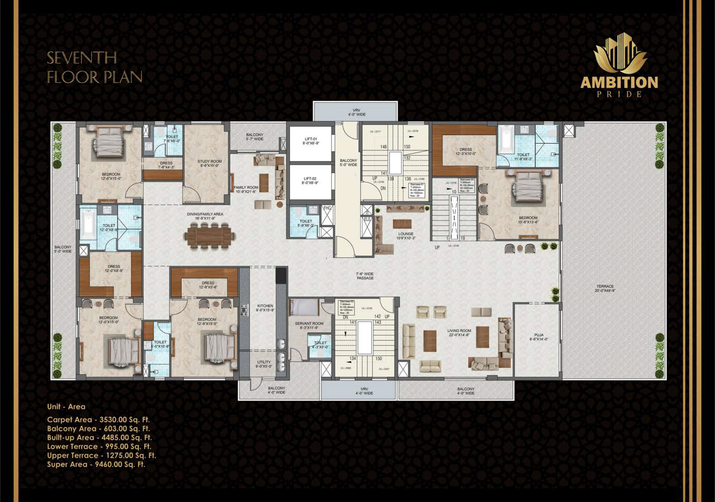Ambition Pride is lavishly designed as an architectural magnificence of its own. Setting the new construction benchmarks in the residential segment, these contemporary residences will surely work their magic on you and your loved ones. Premium Range of 4 BHK boutique residences | Planned & designed by world renowned team